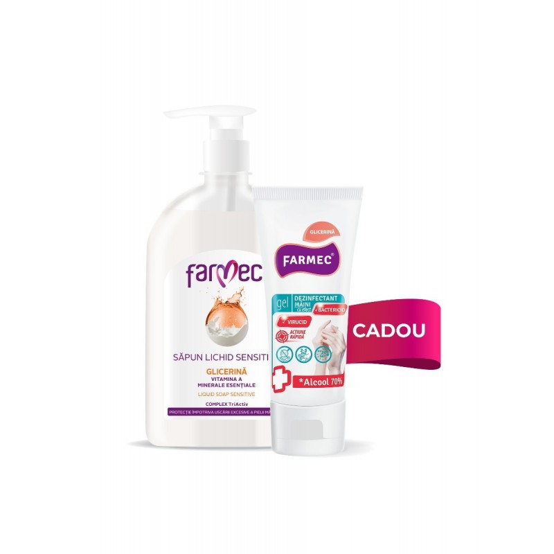 Pachet Promo Sapun Lichid Sensitive Glicerina 500 Ml Cadou Gel Dezinfectant Mini Cu Alcool 70% si Glicerina 50 Ml -