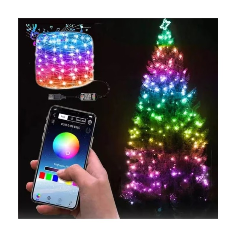 Instalatie De Craciun Smart RGB Wi-Fi Pentru Brad Fir de 10 Metri Conectare Bluetooth 100 Led Aplicatie Mobil Conectare USB